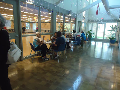 My fitness class starts at 10:15 and today we got a good workout with Brenda. It's a pretty big class (about 24 today) but she manages to give some personal instruction where required. After the class I usually buy a coffee, my first of the day, and have it with a snack. Today I brought a slice of my own zucchini bread to have something fairly healthy.